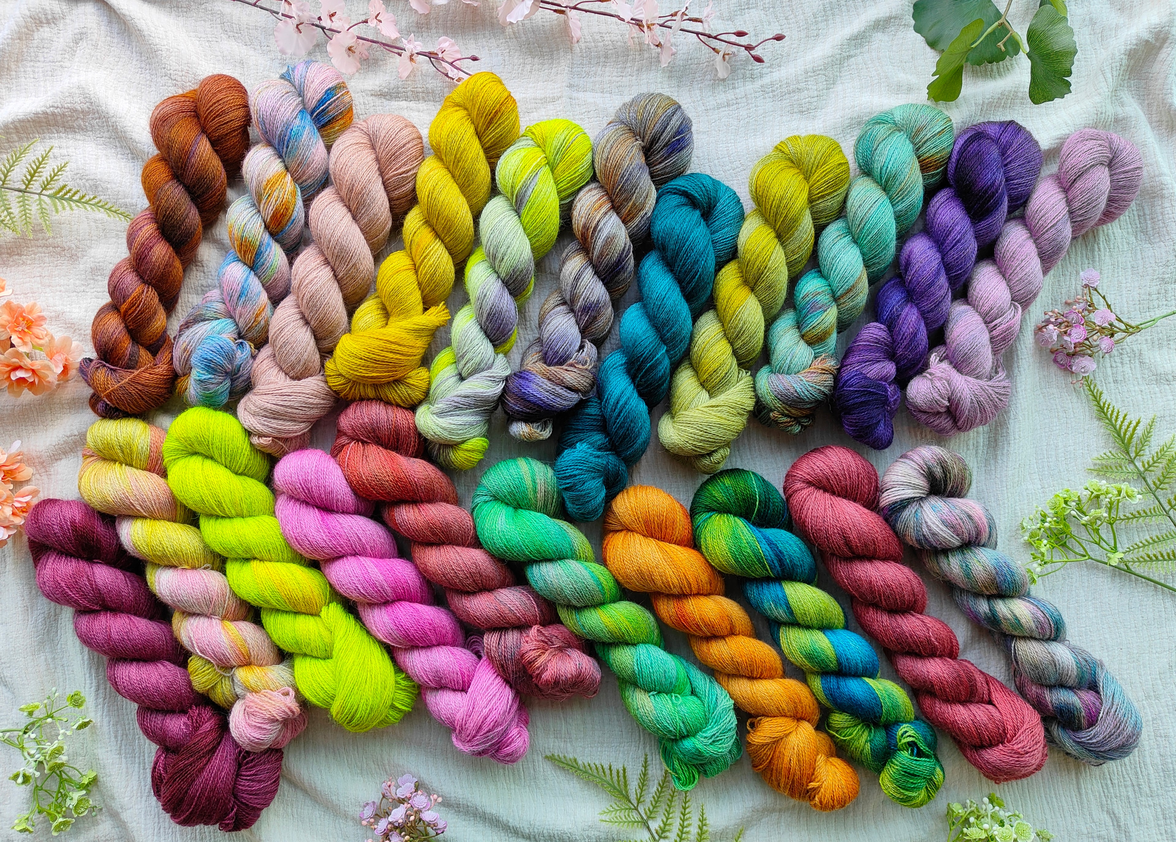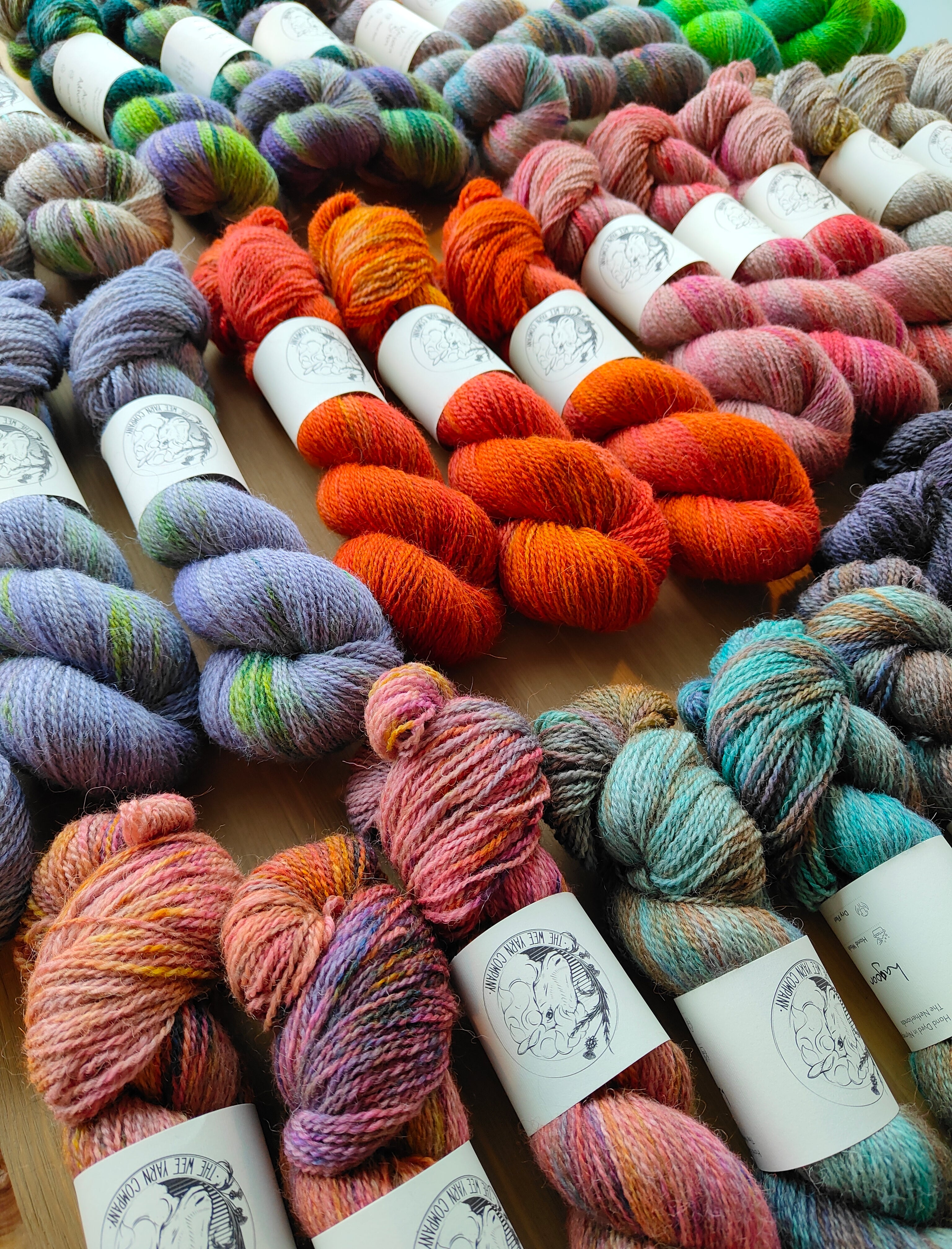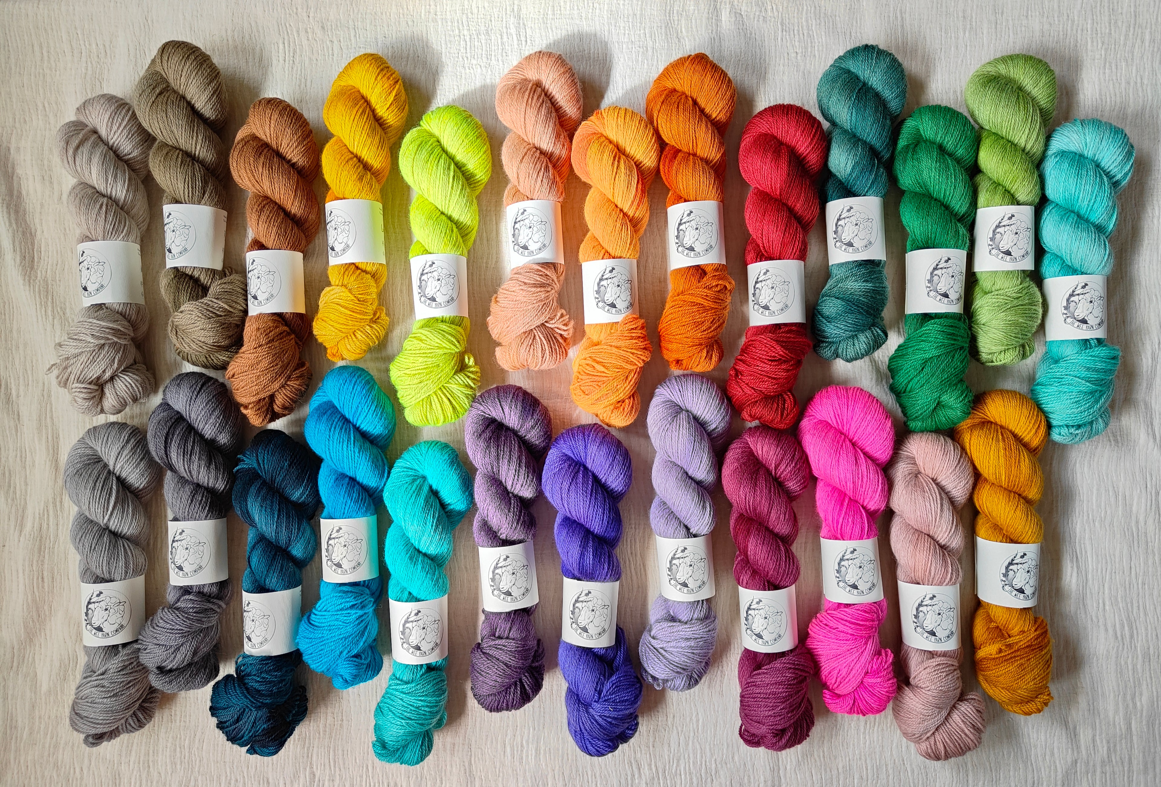 Have a look at the bases we currently dye. Whether you're looking for yarn for socks, beautifull accessoires or garments we have you covered! All of our yarns are mulesing free!