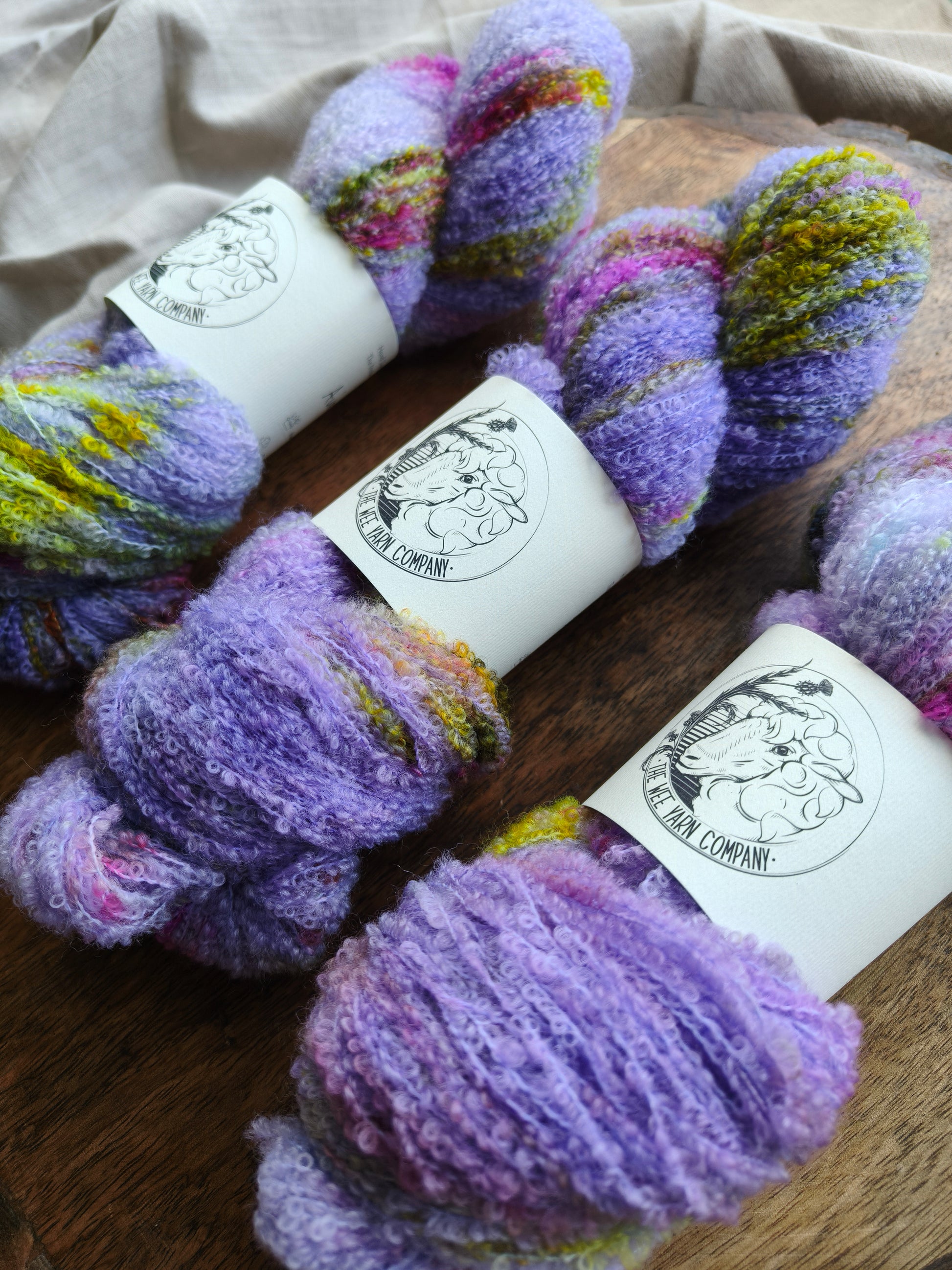 Hyacinth Bouclé is a fabulous lace weight Merino Bouclé yarn perfect for adding amazing texture to your projects. The characteristic loops of Bouclé make the most of the buttery softness that makes merino so popular and the nylon core will add some strength to the overall fabric.