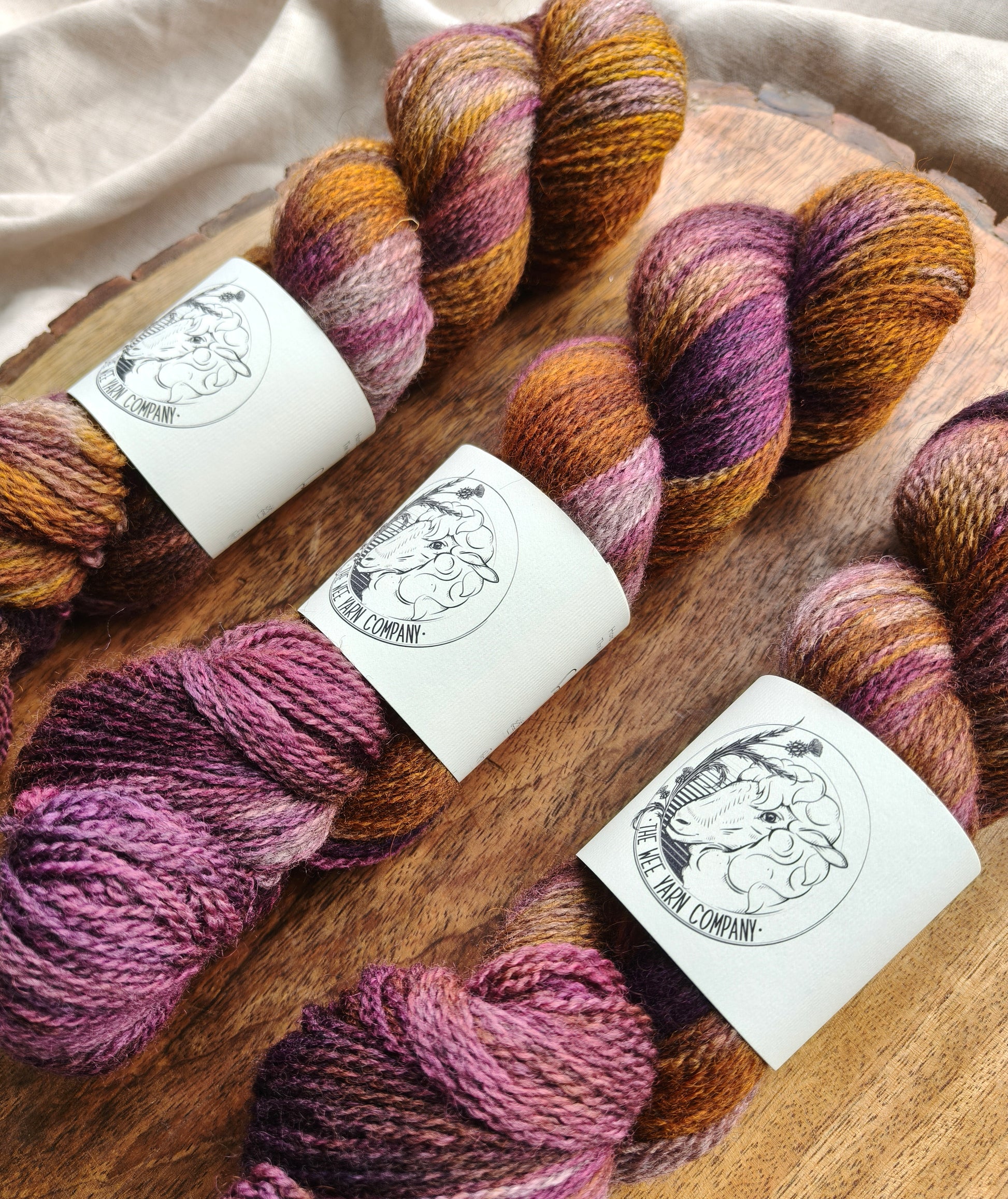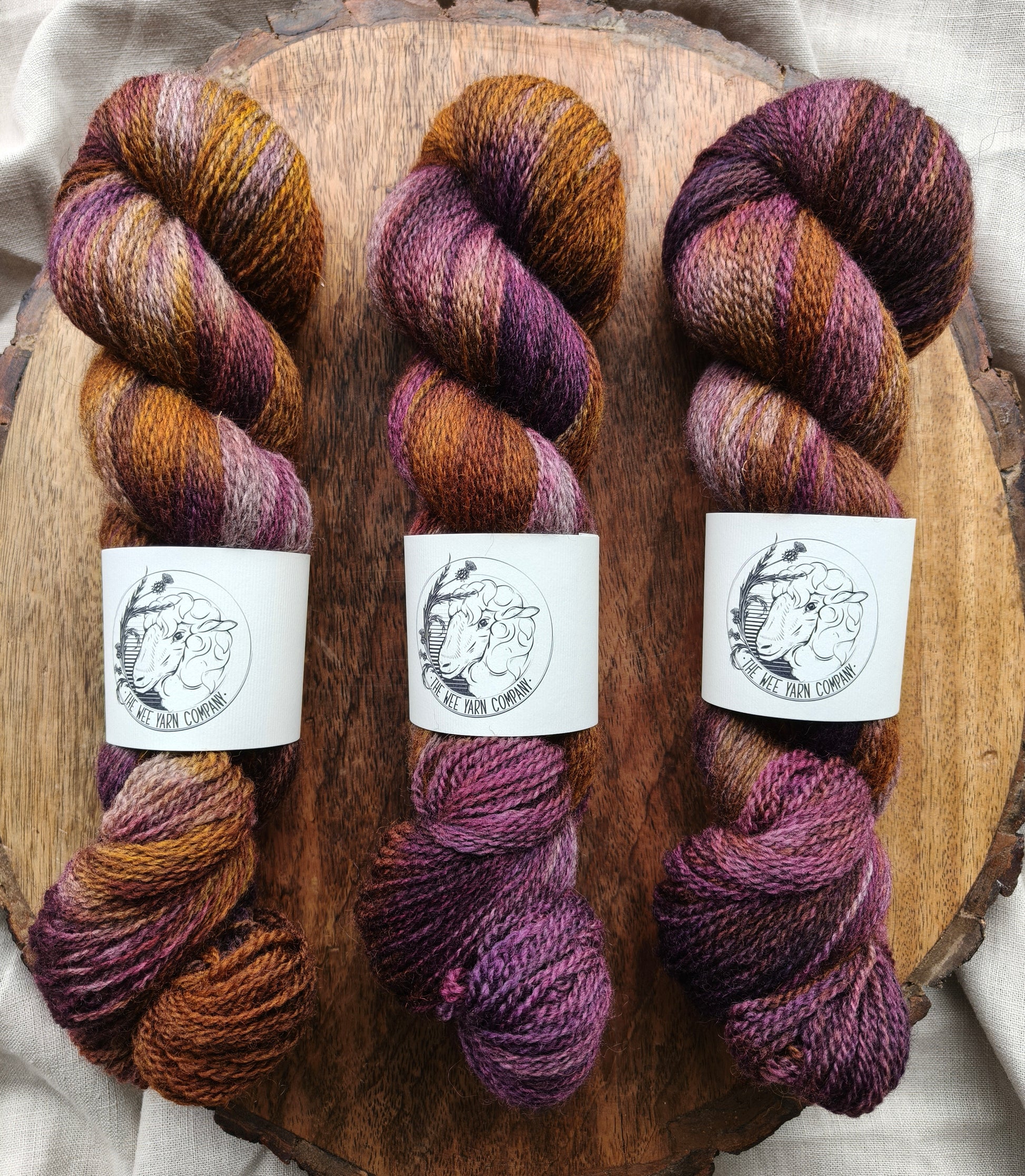 It is 33% Bluefaced Leicester, 33% Falklands Merino, 33% Zwartbles and it is spun in the UK for us by John Arbon Textiles (it's the same as their Harvest Hues 4ply but instead of being dyed in the wool prior to being spun, it's hand-dyed by me). Fingering weight, 100g - 400m.