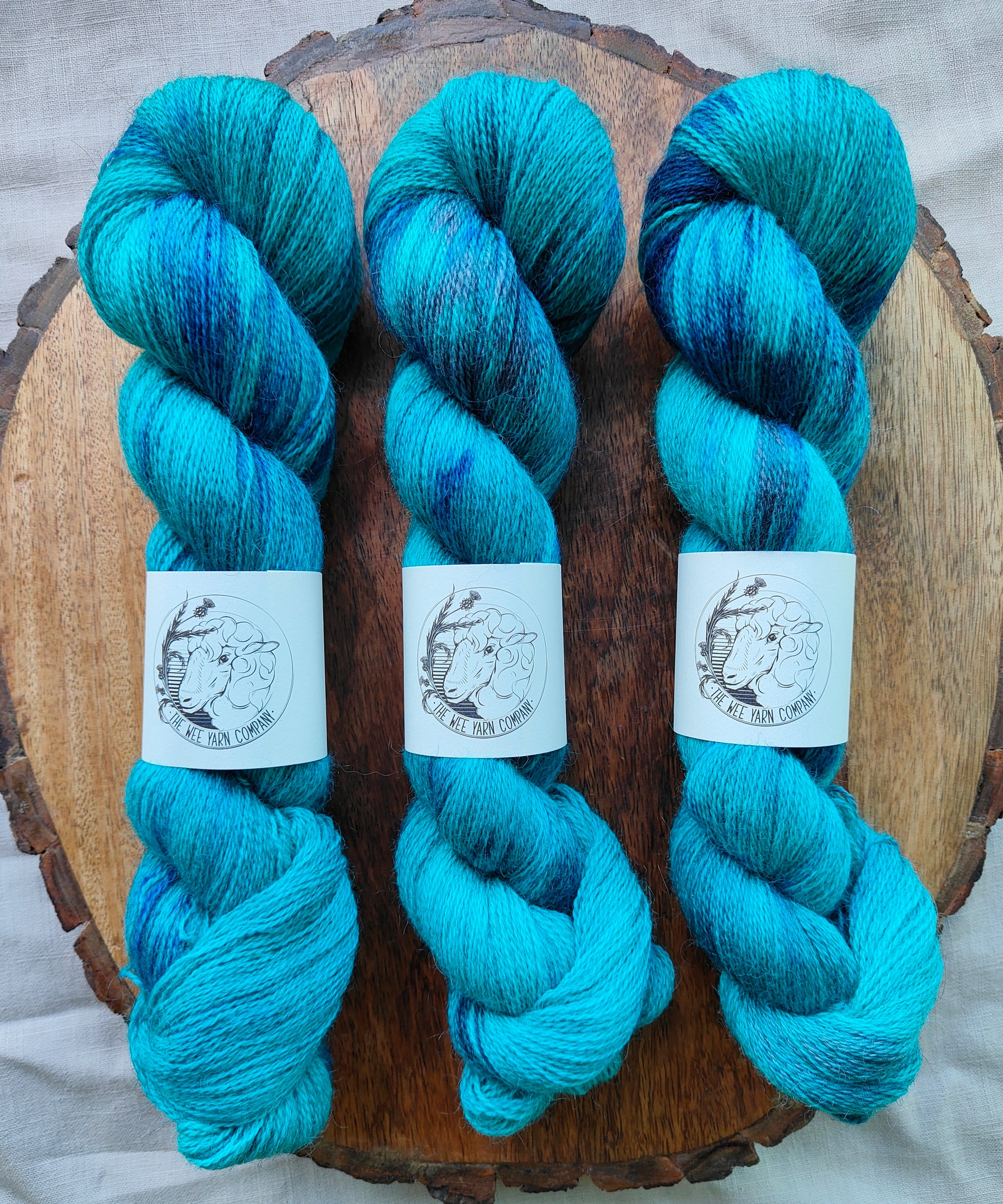 Casta is Scottish Gaelic for twisted or twined, perfectly capturing the two-ply high twist construction. It is a heavy lace weight, coming in at 650m per 100g skein. It can be used single strand of course, but it really comes alive when held together! Held together with one of our fluffy yarns (Coorie In Silk Mohair/Oosey Suri Silkpaca) it will give you a wonderful sport weight, so too will holding it together with itself give you a sport weight! When holding it double with itself it creates a fabric that is so beautiful and squishy yet still feels incredibly delicate which I love. Being designed to be held double stranded also gives you a whole realm of colour possibilities as you can marl them together, even fading out one strand at a time, or just stick with two strands of the same colourway.
