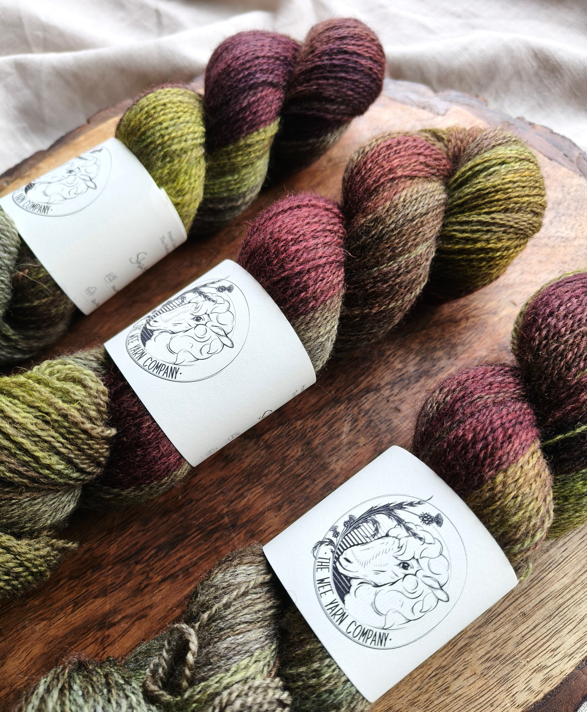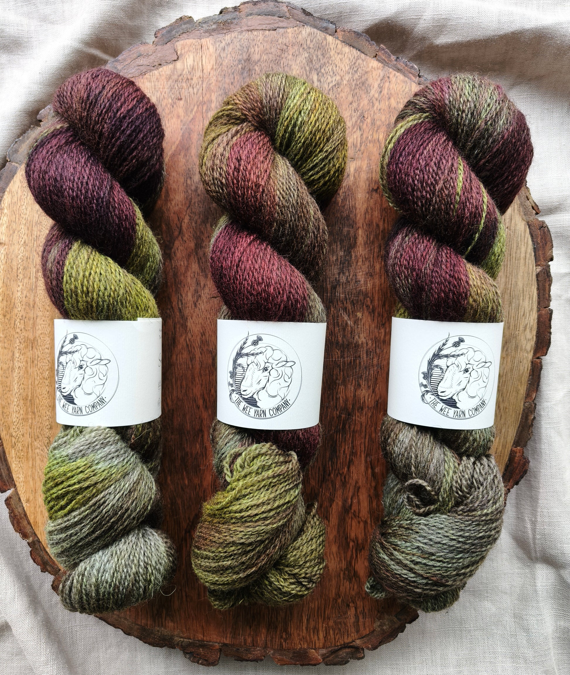 It is 33% Bluefaced Leicester, 33% Falklands Merino, 33% Zwartbles and it is spun in the UK for us by John Arbon Textiles (it's the same as their Harvest Hues 4ply but instead of being dyed in the wool prior to being spun, it's hand-dyed by me). Fingering weight, 100g - 400m.