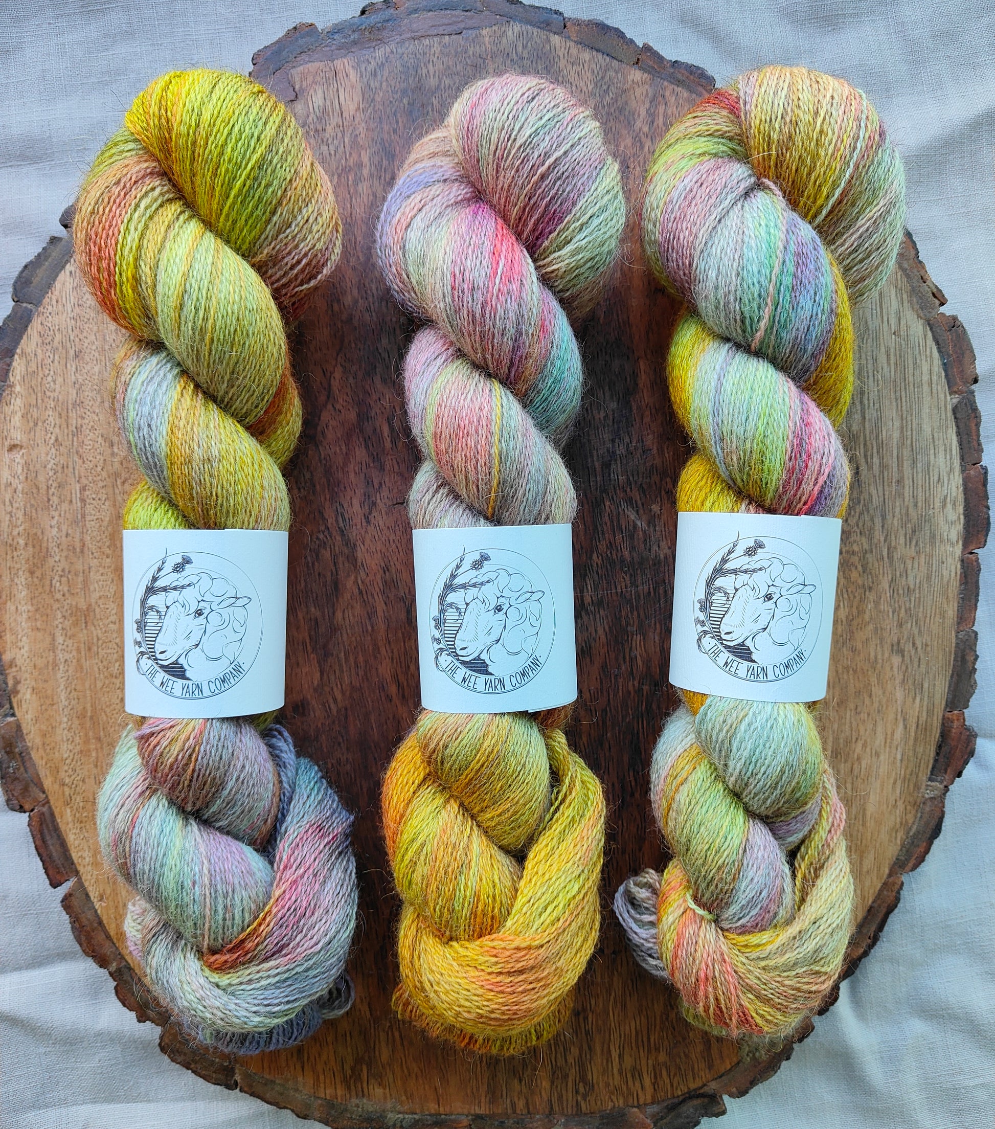 Casta is Scottish Gaelic for twisted or twined, perfectly capturing the two-ply high twist construction. It is a heavy lace weight, coming in at 650m per 100g skein. It can be used single strand of course, but it really comes alive when held together! Held together with one of our fluffy yarns (Coorie In Silk Mohair/Oosey Suri Silkpaca) it will give you a wonderful sport weight, so too will holding it together with itself give you a sport weight! When holding it double with itself it creates a fabric that is so beautiful and squishy yet still feels incredibly delicate which I love. Being designed to be held double stranded also gives you a whole realm of colour possibilities as you can marl them together, even fading out one strand at a time, or just stick with two strands of the same colourway.