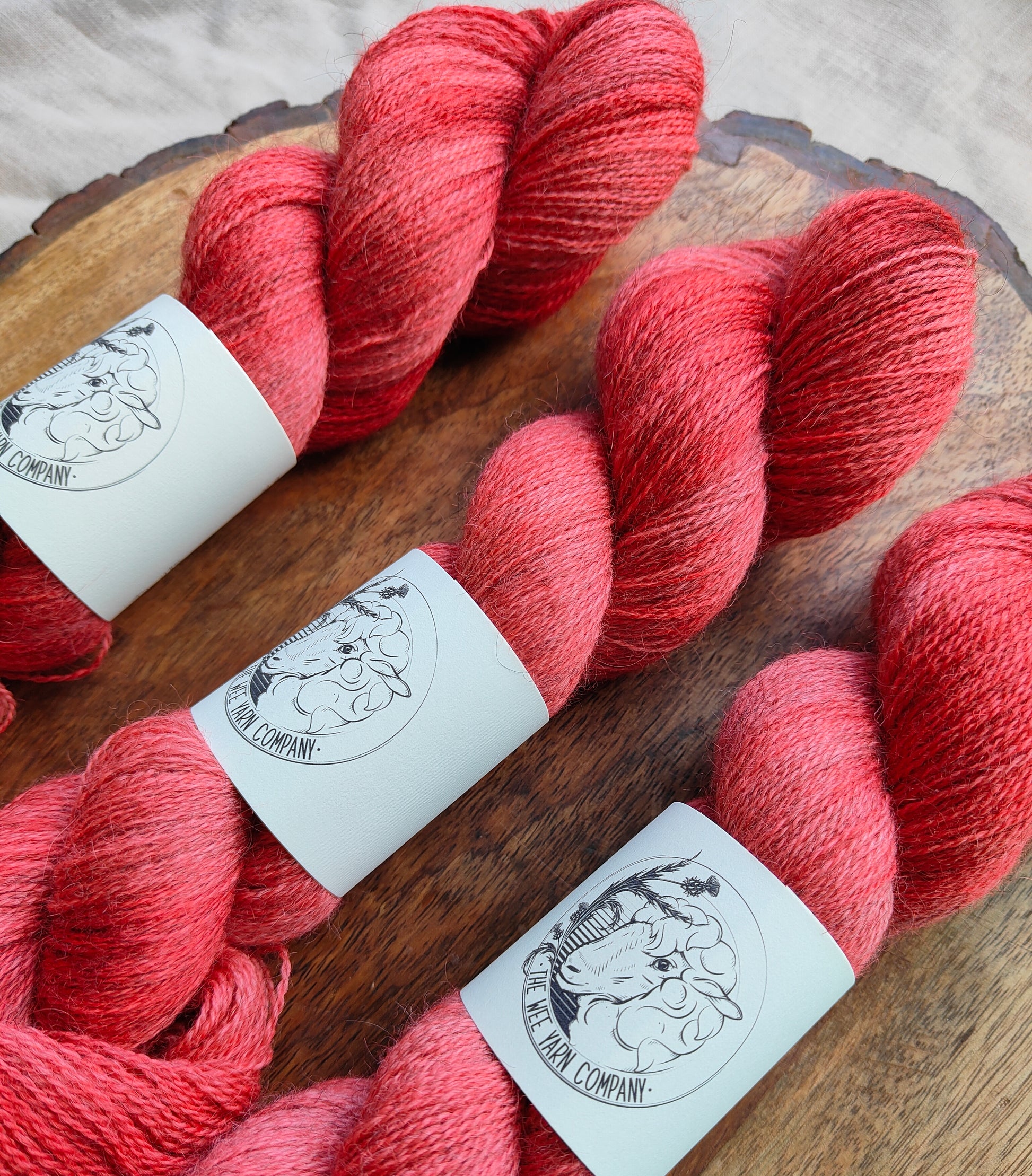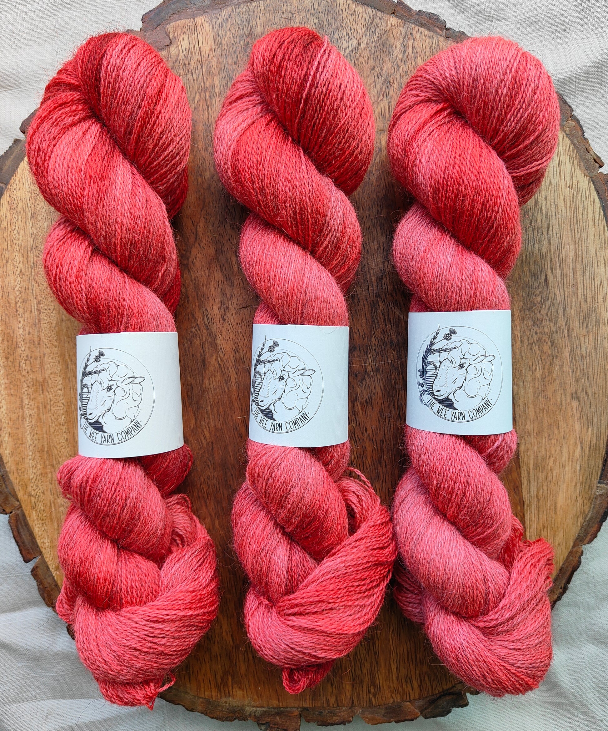 Casta is Scottish Gaelic for twisted or twined, perfectly capturing the two-ply high twist construction. It is a heavy lace weight, coming in at 650m per 100g skein. It can be used single strand of course, but it really comes alive when held together! Held together with one of our fluffy yarns (Coorie In Silk Mohair/Oosey Suri Silkpaca) it will give you a wonderful sport weight, so too will holding it together with itself give you a sport weight! When holding it double with itself it creates a fabric that is so beautiful and squishy yet still feels incredibly delicate which I love. Being designed to be held double stranded also gives you a whole realm of colour possibilities as you can marl them together, even fading out one strand at a time, or just stick with two strands of the same colourway.