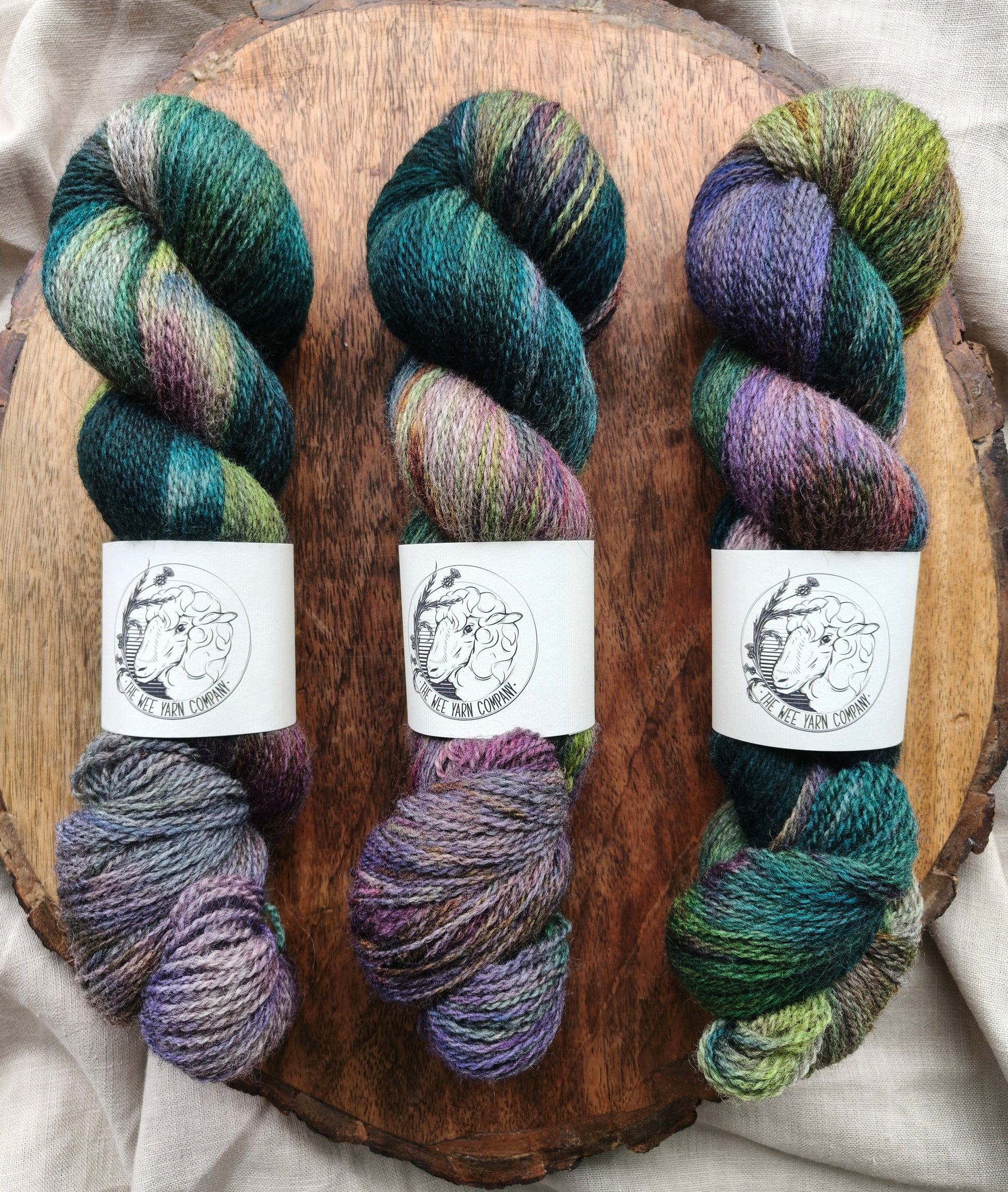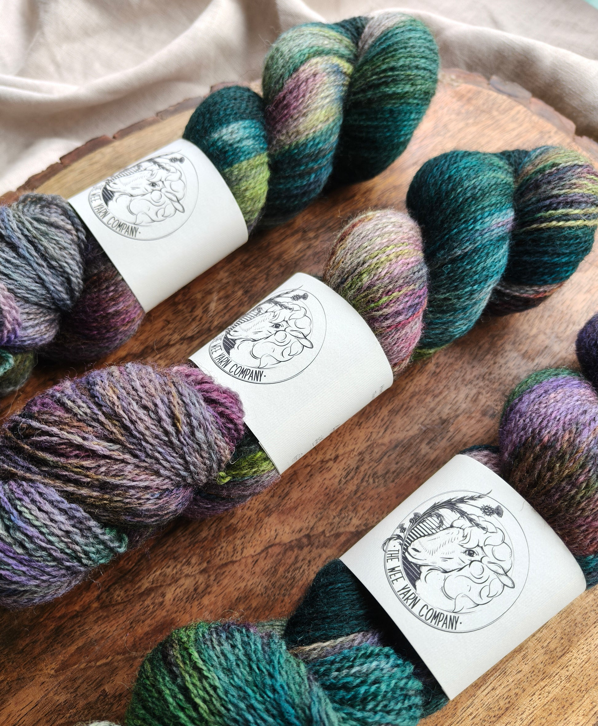 It is 33% Bluefaced Leicester, 33% Falklands Merino, 33% Zwartbles and it is spun in the UK for us by John Arbon Textiles (it's the same as their Harvest Hues 4ply but instead of being dyed in the wool prior to being spun, it's hand-dyed by me). Fingering weight, 100g - 400m.