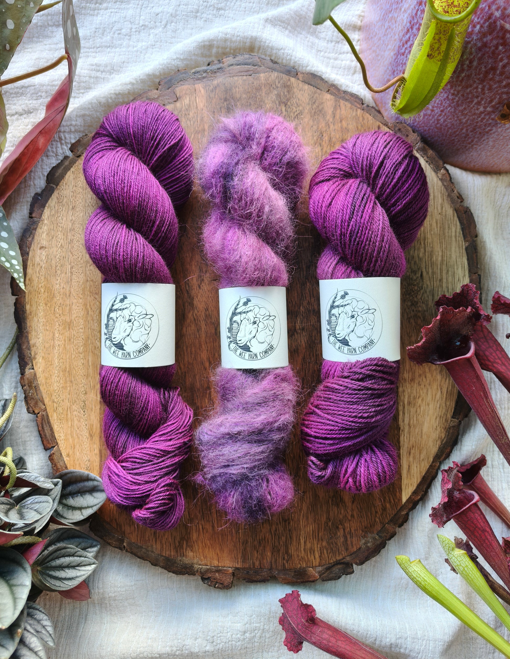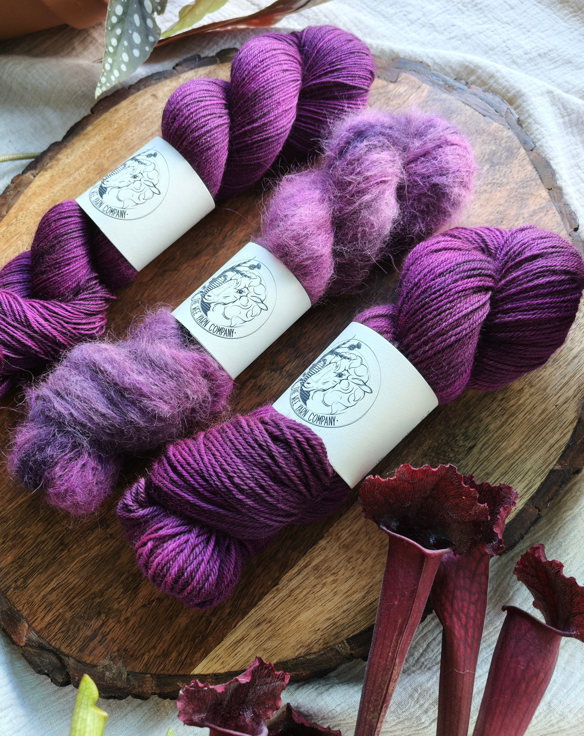 Available on Bonnie BFL Sock, Oosey Suri Silkpaca, and Àrd DK! Displayed in the picture from left to right in order mentioned.