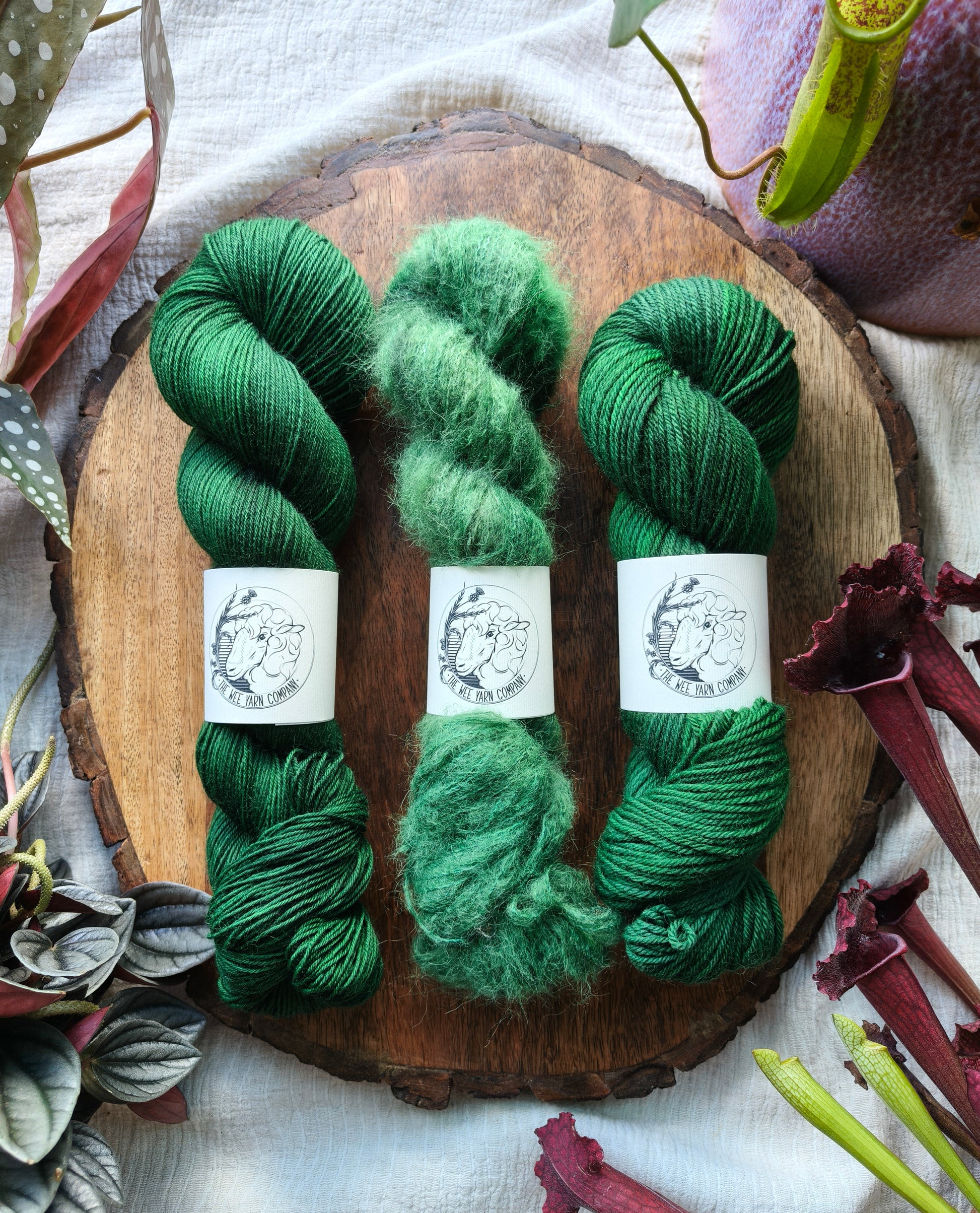 Available on Bonnie BFL Sock, Oosey Suri Silkpaca, and Àrd DK! Displayed in the picture from left to right in order mentioned.