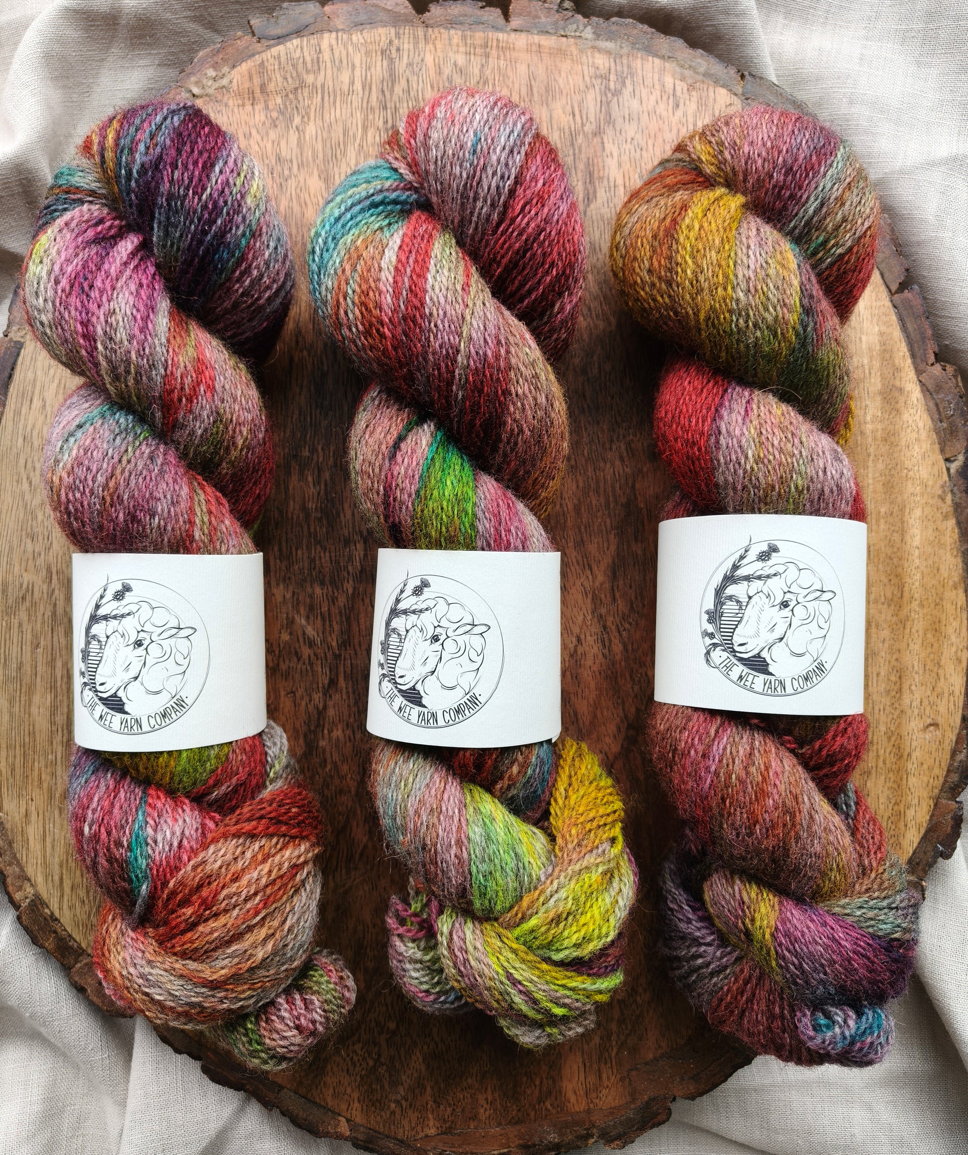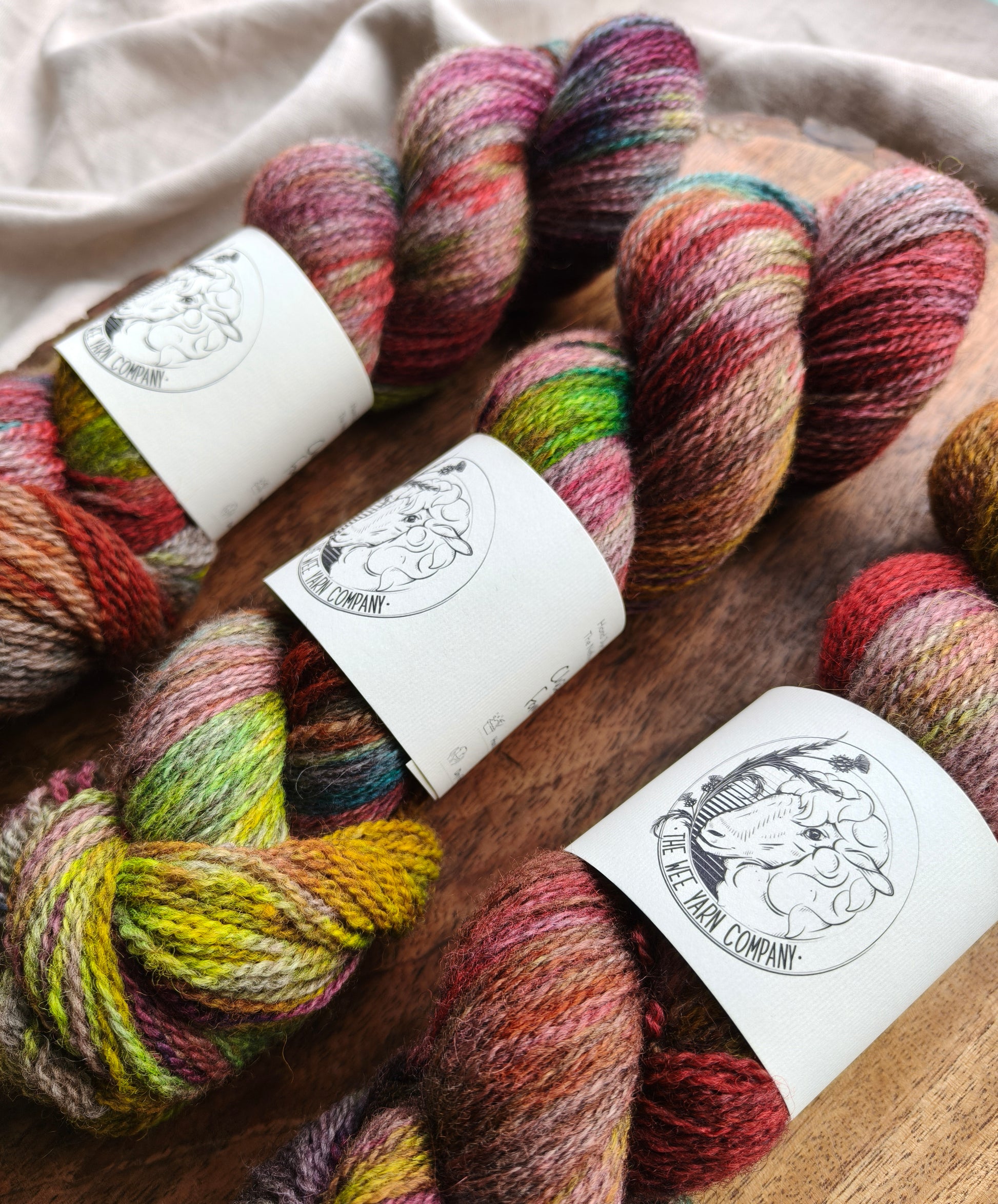 It is 33% Bluefaced Leicester, 33% Falklands Merino, 33% Zwartbles and it is spun in the UK for us by John Arbon Textiles (it's the same as their Harvest Hues 4ply but instead of being dyed in the wool prior to being spun, it's hand-dyed by me). Fingering weight, 100g - 400m.