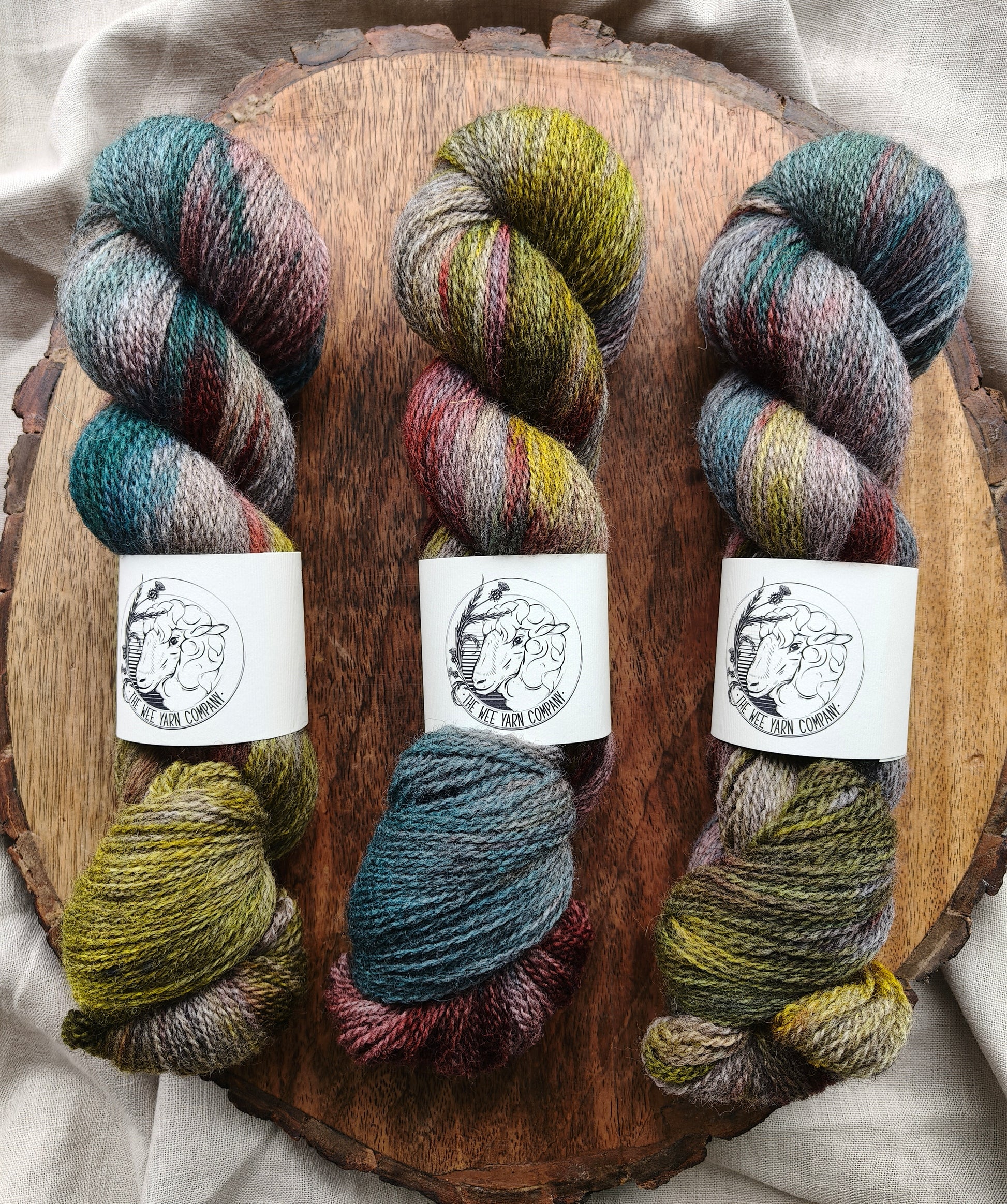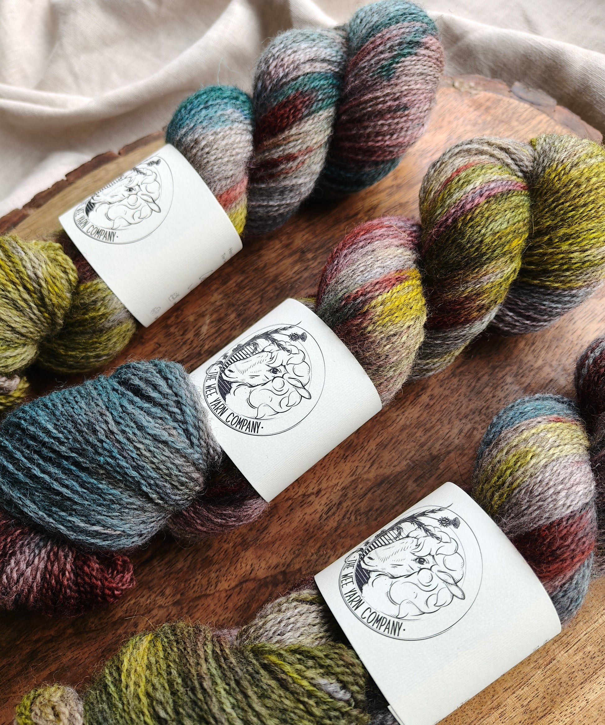 It is 33% Bluefaced Leicester, 33% Falklands Merino, 33% Zwartbles and it is spun in the UK for us by John Arbon Textiles (it's the same as their Harvest Hues 4ply but instead of being dyed in the wool prior to being spun, it's hand-dyed by me). Fingering weight, 100g - 400m.