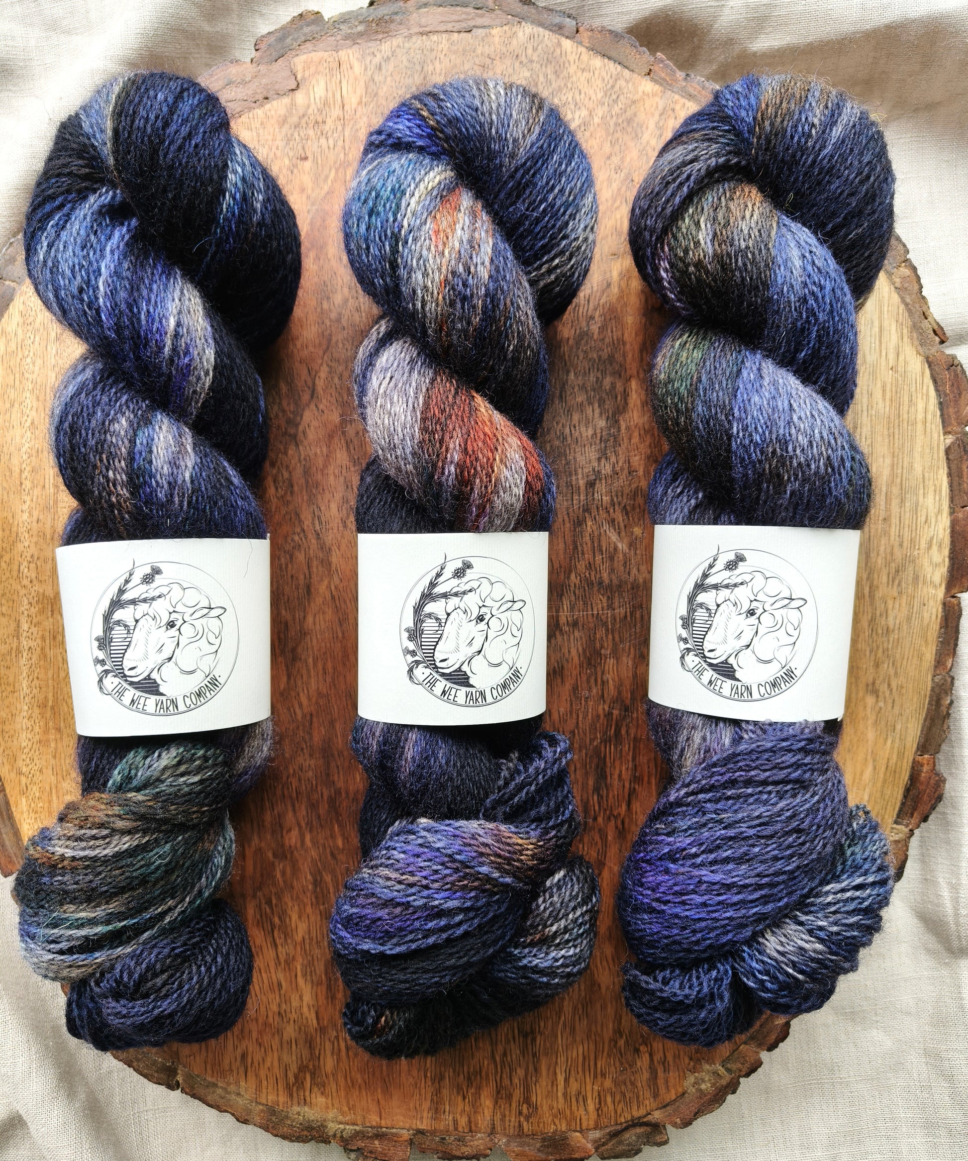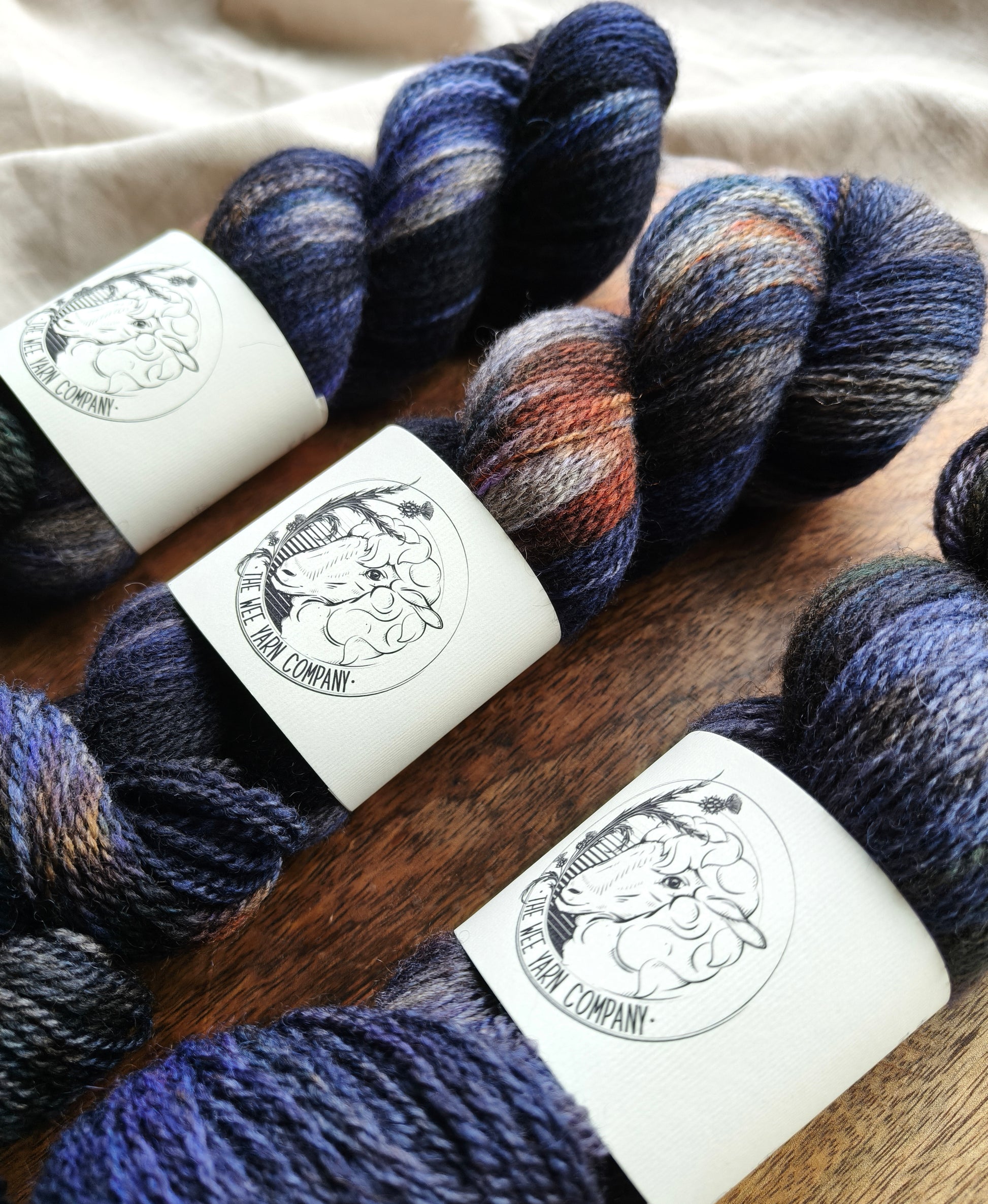 It is 33% Bluefaced Leicester, 33% Falklands Merino, 33% Zwartbles and it is spun in the UK for us by John Arbon Textiles (it's the same as their Harvest Hues 4ply but instead of being dyed in the wool prior to being spun, it's hand-dyed by me). Fingering weight, 100g - 400m.