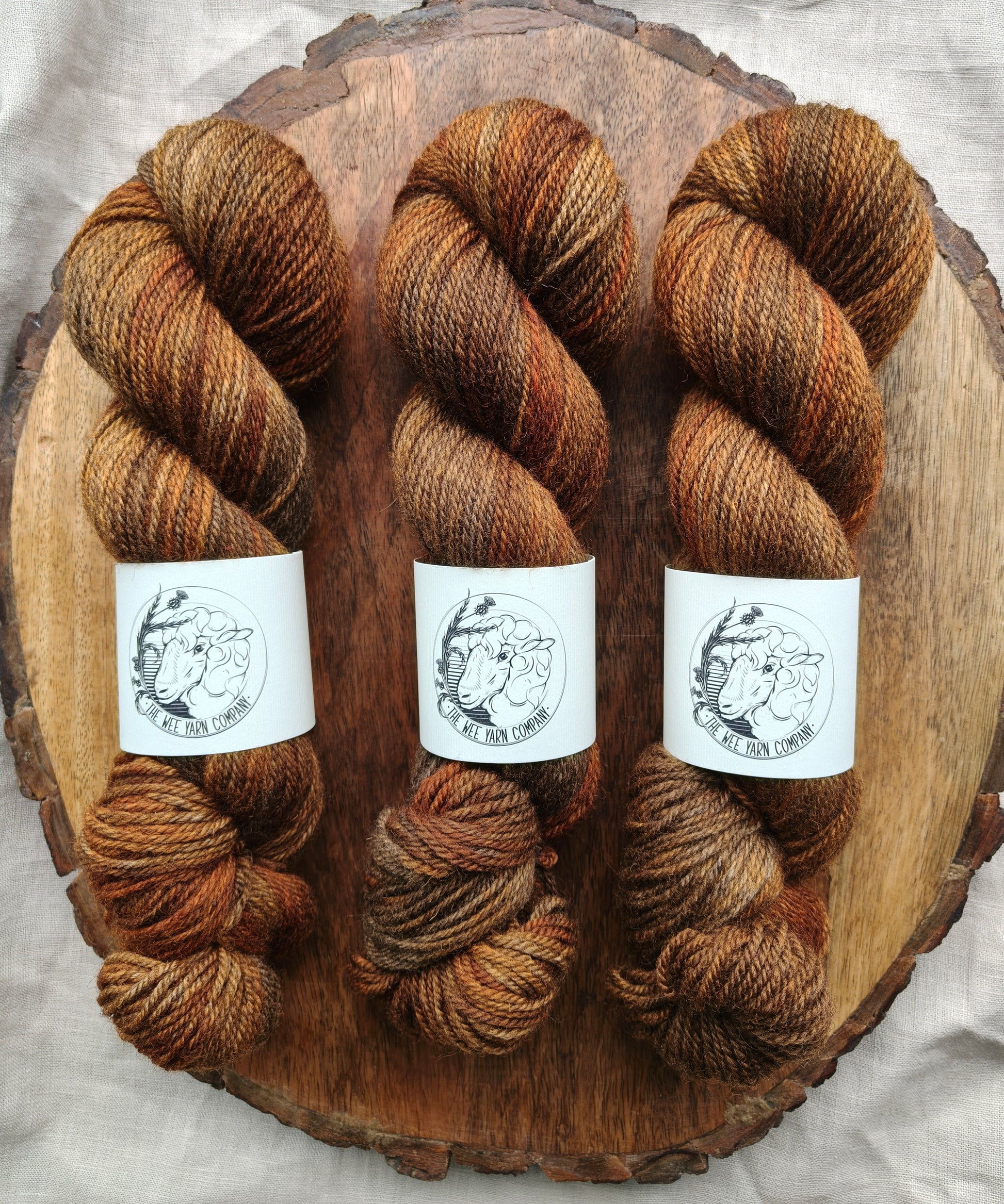 It is 33% Bluefaced Leicester, 33% Falklands Merino, 33% Zwartbles and it is spun in the UK for us by John Arbon Textiles (it's the same as their Harvest Hues but instead of being dyed in the wool prior to being spun, it's hand-dyed by me). Worsted weight, 100g - 200m.