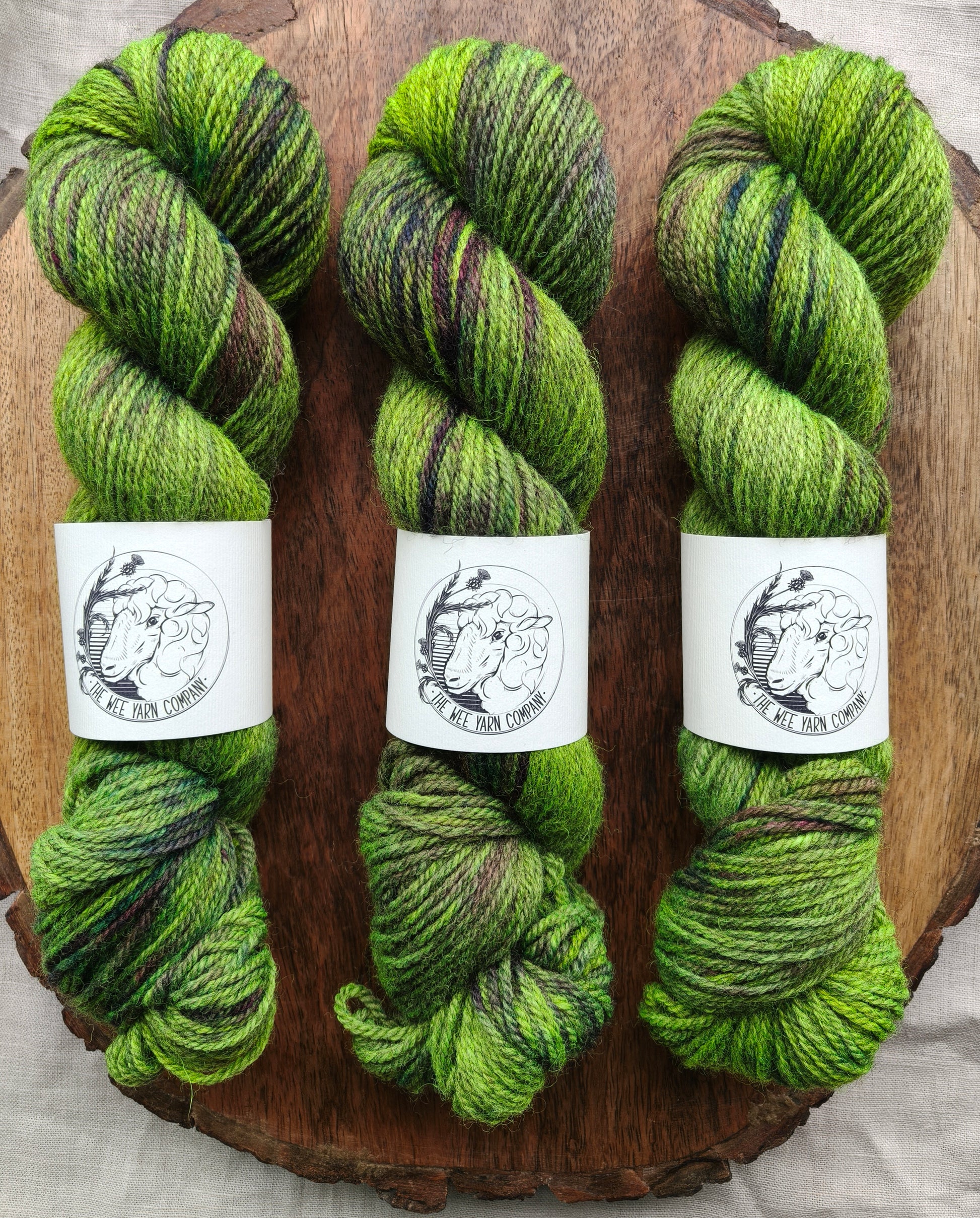 It is 33% Bluefaced Leicester, 33% Falklands Merino, 33% Zwartbles and it is spun in the UK for us by John Arbon Textiles (it's the same as their Harvest Hues but instead of being dyed in the wool prior to being spun, it's hand-dyed by me). Worsted weight, 100g - 200m.