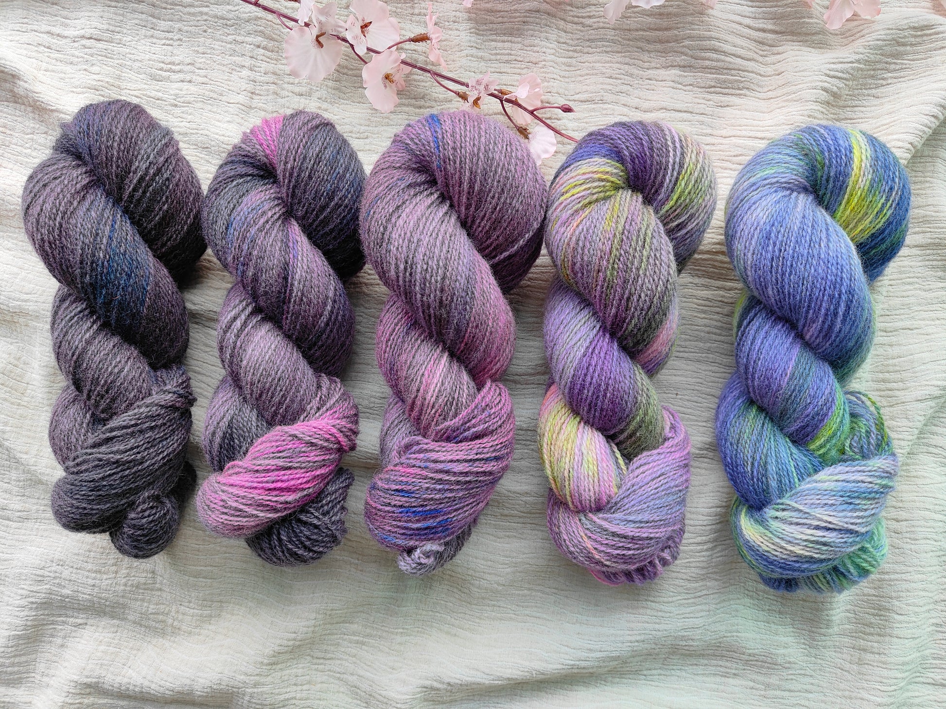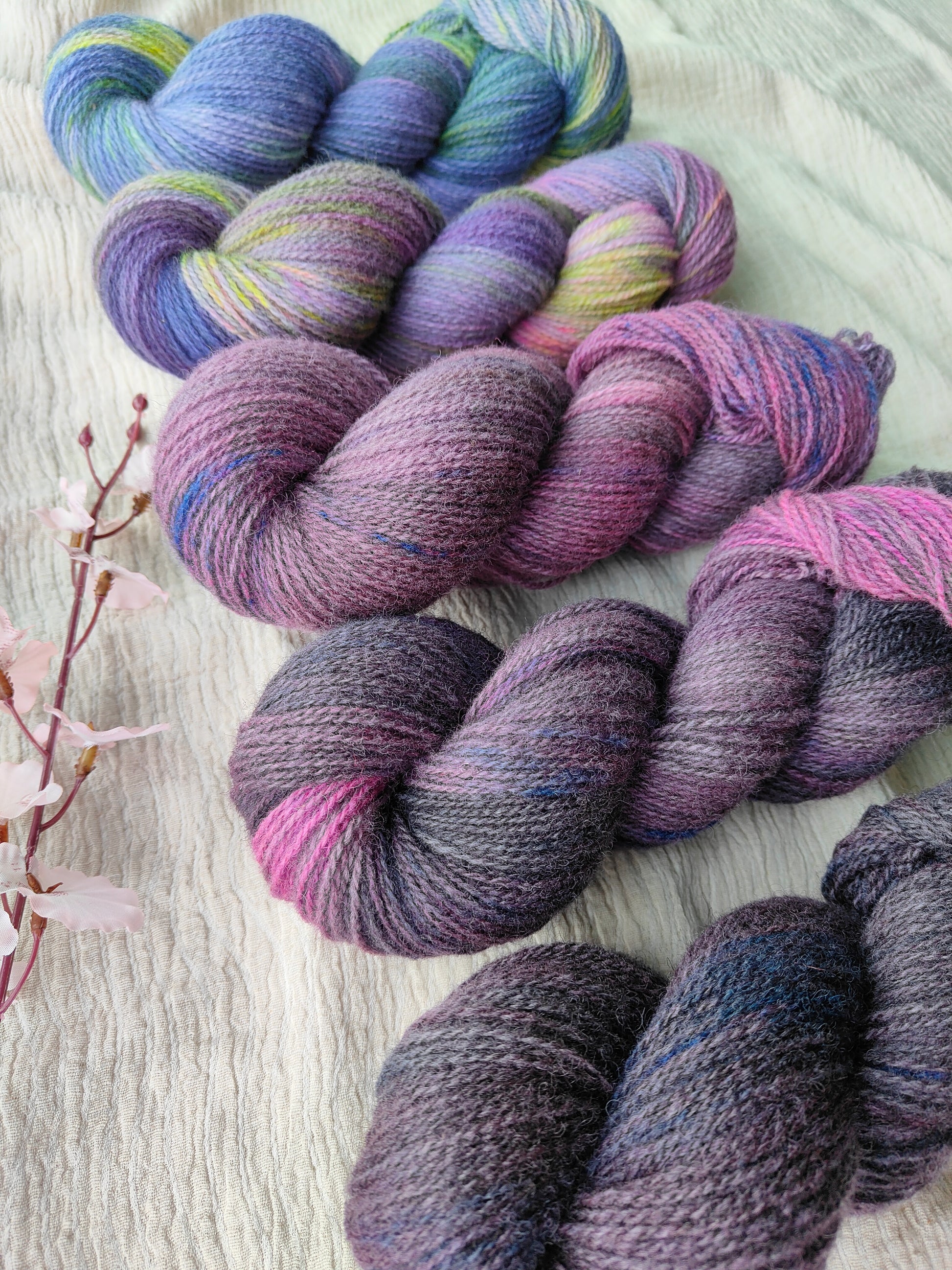 A five skein fade set. Each skein is 100g: 366m and is 100% Shetland Wool. These are dyed on Jamieson & Smith 2ply Jumper Weight. This amazing yarn is a beautiful rustic delight to dye & work with! Jamieson & Smith purchase over 80% of the annual clip of wool in Shetland and helps to sustain the amazing crofting industry there as well as continue the legacy, history, and culture surrounding yarn & textiles deeply imbedded in Shetland.