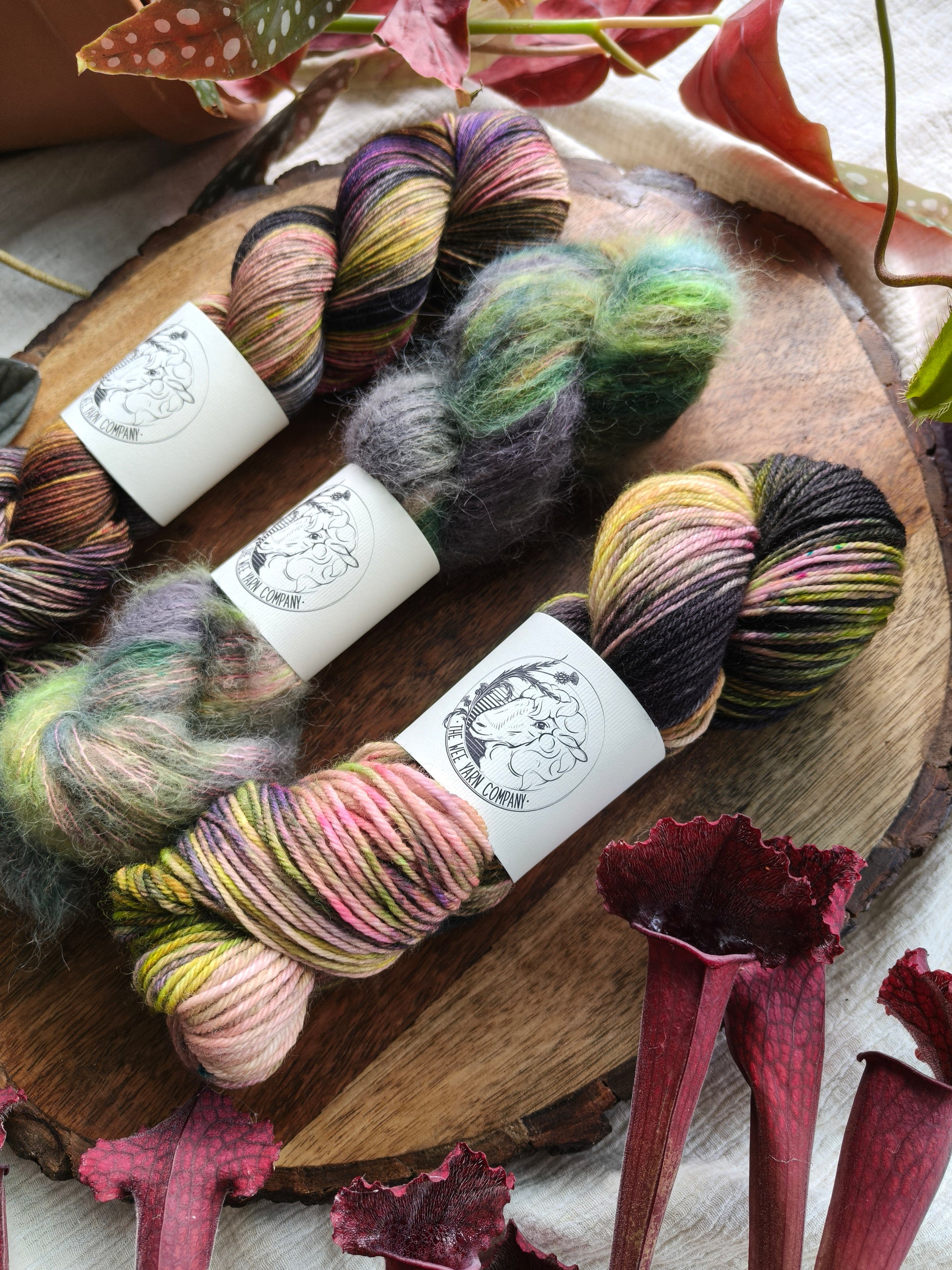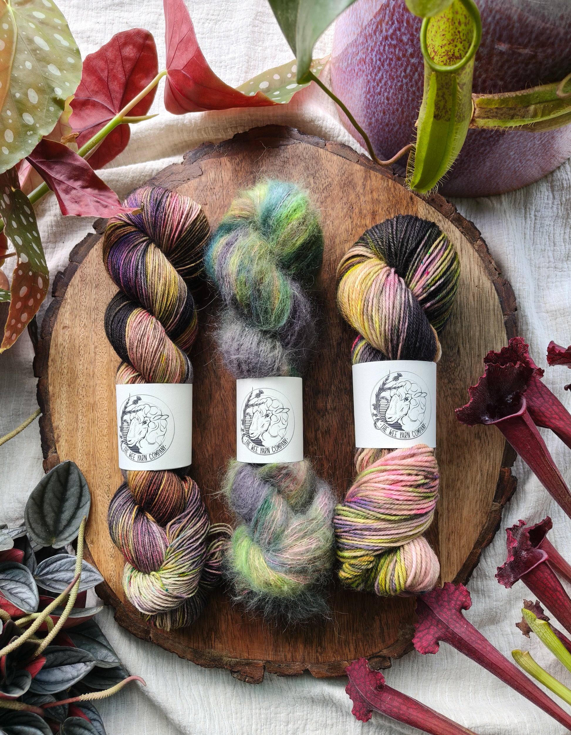 Available on Bonnie BFL Sock, Oosey Suri Silkpaca, and Àrd DK! Displayed in the picture from left to right in order mentioned.