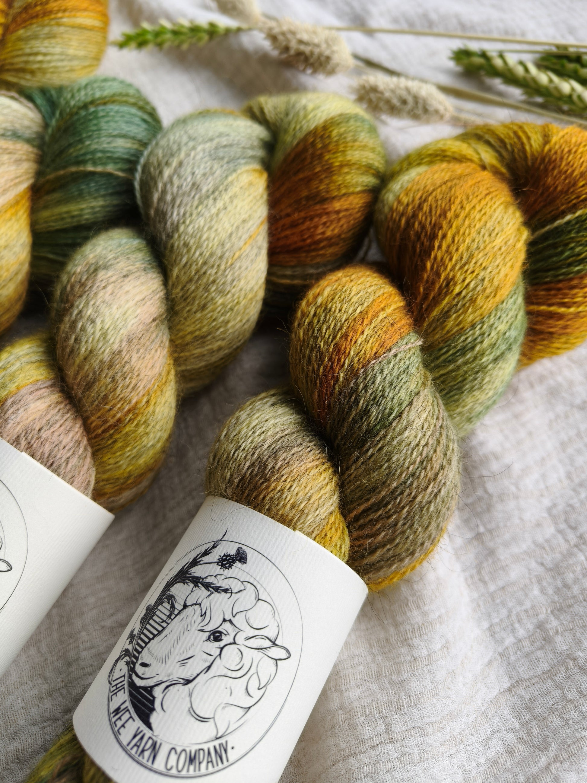 Our first custom milled base, created exclusively for us! 50% Falkland Merino, 25% Gotland, & 25% Corriedale. Casta is Scottish Gaelic for twisted or twined, perfectly capturing the two-ply high twist construction. It is a heavy lace weight, coming in at 650m per 100g skein. Can be held double to give a Sport weight gauge.