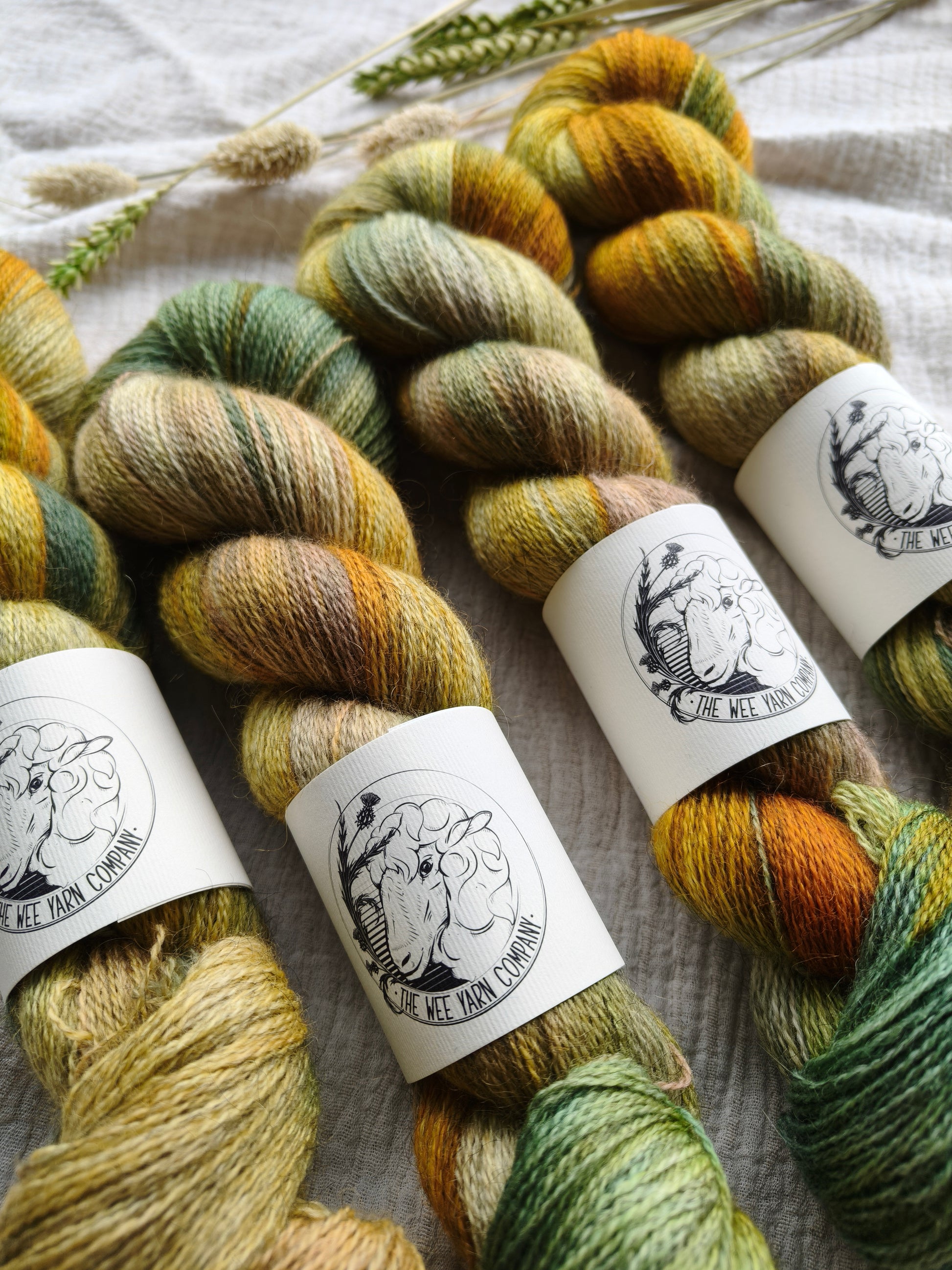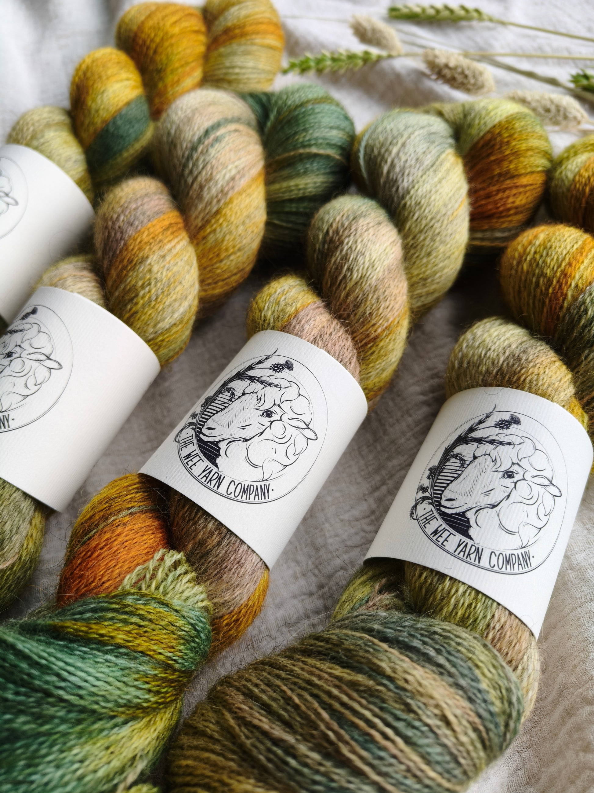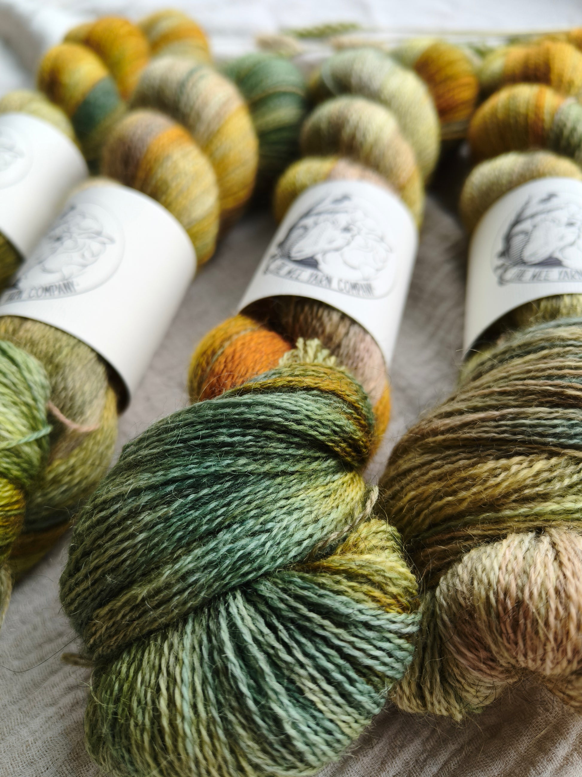 The pictures shown are the colourway on Casta Lace, but there's also the option for Mirknen: this base should dye up very similar to Casta and offers a fingering weight alternative to the original.